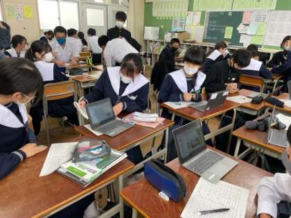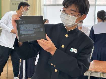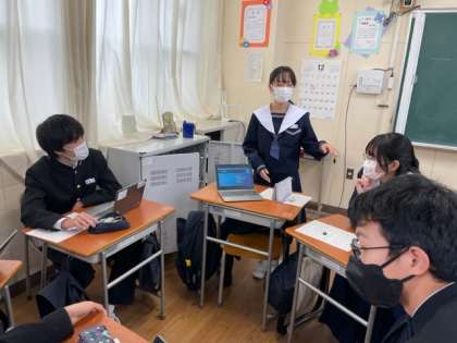 職場体験で学んだことをまとめたパワーポイントを発表しています。