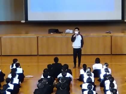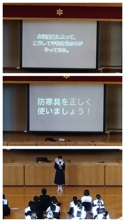 続いて、生活委員会が制作した「防寒着について」の動画をみて、「防寒着を正しく使いましょう!」という声かけがありました。