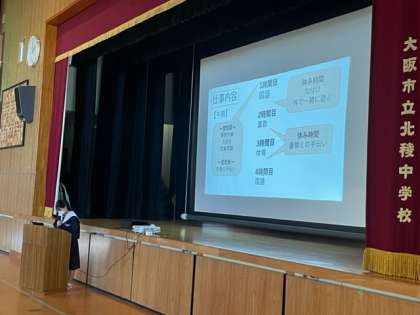 各クラスより2人ずつ代表を選び、職場体験の学年全体での発表会を行いました。