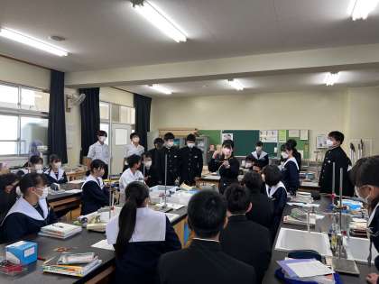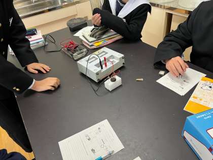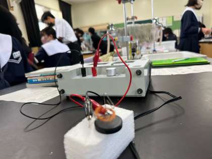 1つめは電磁誘導の実験。自分の持ち物を磁化して実験している生徒もいました。素晴らしい!