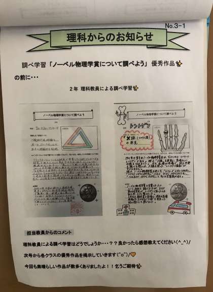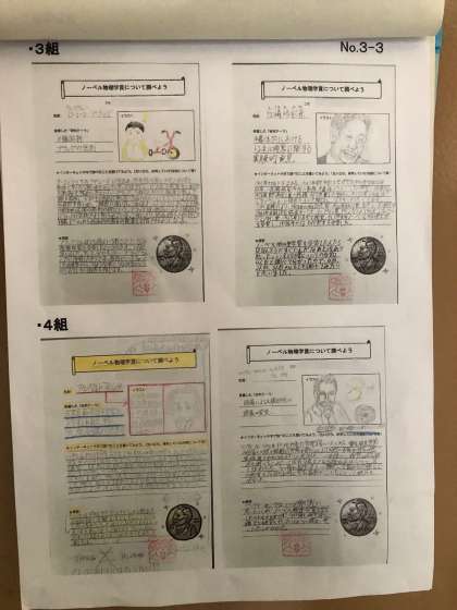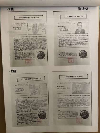 ノーベル物理学賞を受賞された方や研究テーマ・内容について、1人1台タブレット端末を活用しながら調べ学習を行いました。