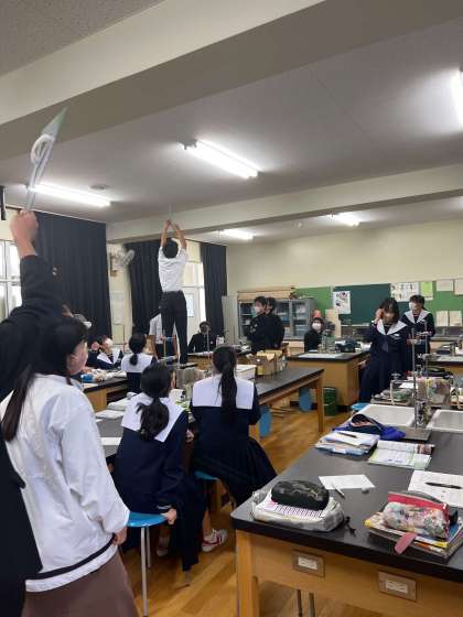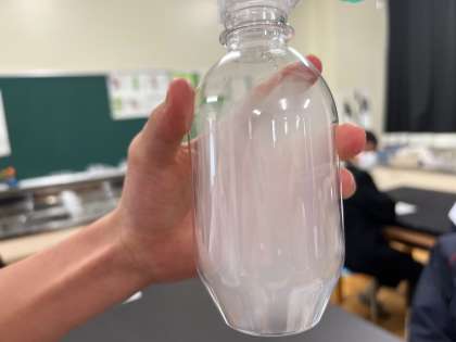 本日の「めあて」の実験の前に、ペットボトルを使った雲の発生モデル実験を各班でしました。