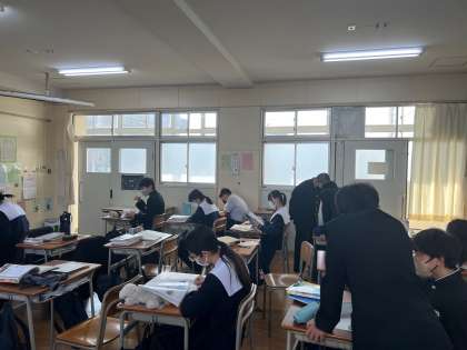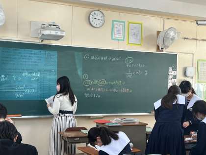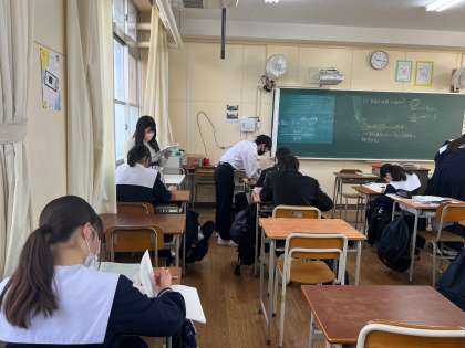 今日ら湿度に関する問題練習をしました。先生のヒントをもとに、自然に教え合い活動が始まり、「飽和水蒸気量」や「露点」という言葉が教室に飛び交い、学び合っていました。