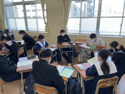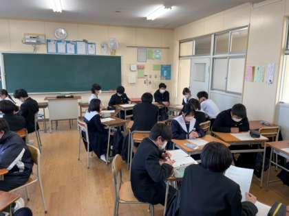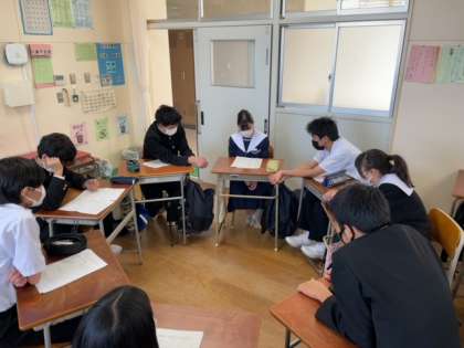 6時間目、2年生は進路学習のまとめとして、これまでそれぞれが調べてきた私立、公立高校の情報交換を班で行いました。