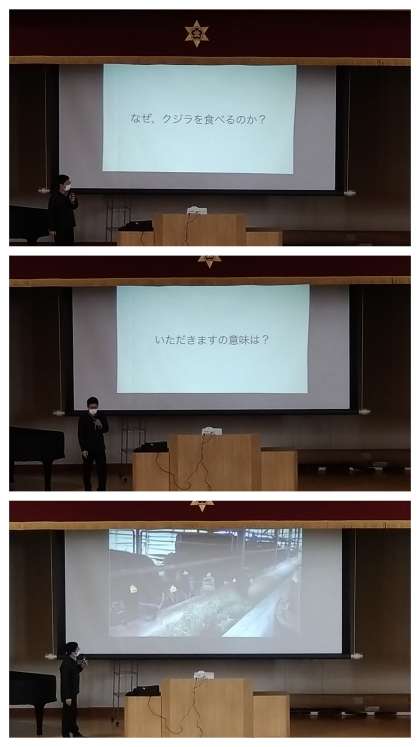 今朝は、1年生の学年朝礼がありました。担当の先生からは、『食事』についてのお話がありました。