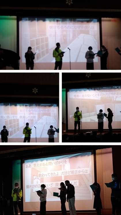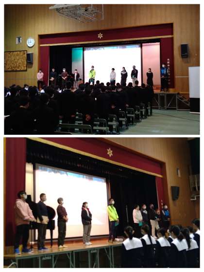 3年生の先生方から卒業生に、RADWIMPS『正解』の歌によるメッセージが送られました(サプライズです)。「答え合わせの時に私はもういない だから採点基準はあなたのこれからの人生 『よーい、はじめ』で締めくくられました!
