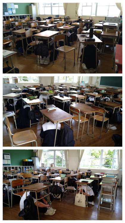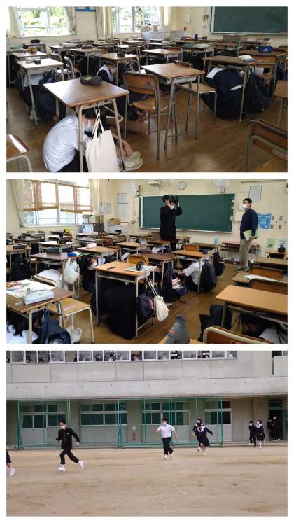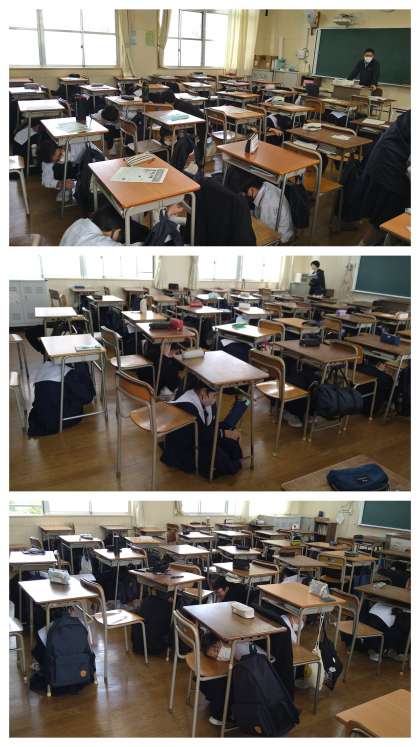 あるクラスの担任の先生と生徒一名は、身体が大きすぎて机の下には入れず、カバンでしっかりと頭部を守る姿勢をとっていました。みんな真剣に取り組んでいました。
