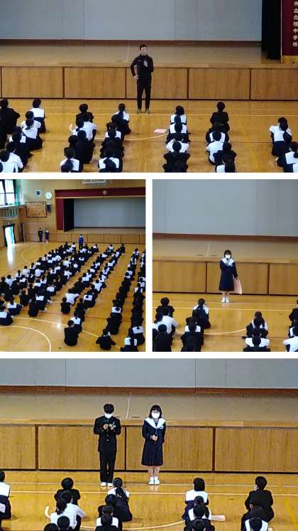 挨拶は、表現の仕方はそれぞれ違うと思うが、大切なコミュニケーションツールです。北稜中の良いところは、多くの生徒が気持ちの良い挨拶ができることです。挨拶がきちんとできる集団になってほしいと思っていますという内容のお話がありました。