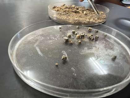 後半、今日のお土産観察は「土の中から鉱物を探そう」顧問がクマに怯えながら奈良の山奥で採集してきた粘土質の土の中から、黄鉄鉱の結晶を探しました。