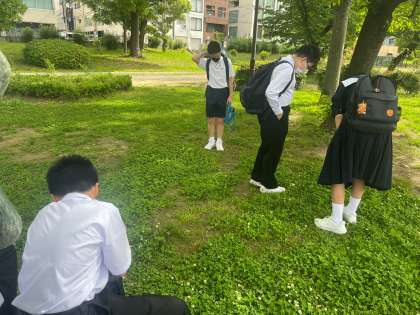 本日、サイエンス部では大阪市立科学館で施設見学とサイエンスショーへの参加を予定しています。現在、学校から科学館まで歩く途中休憩で、生徒たちは元気に四葉のクローバーを探していました。