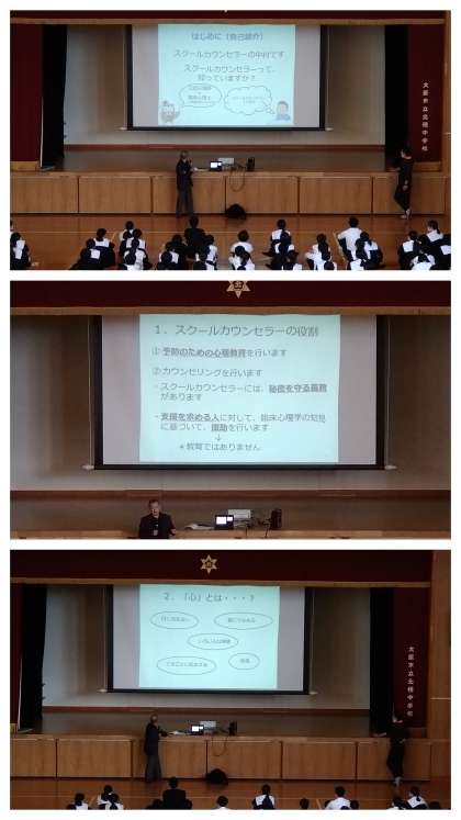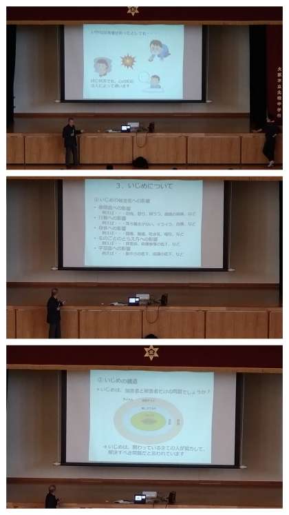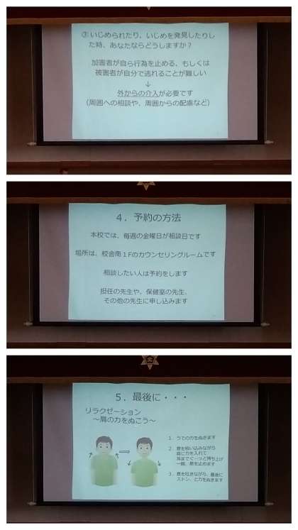 本校のスクールカウンセラーの中村先生から『スクールカウンセラーの役割』や『いじめについて』のお話がありました。