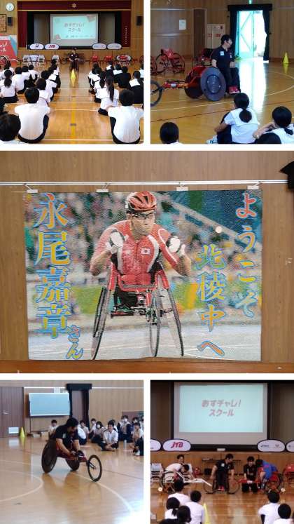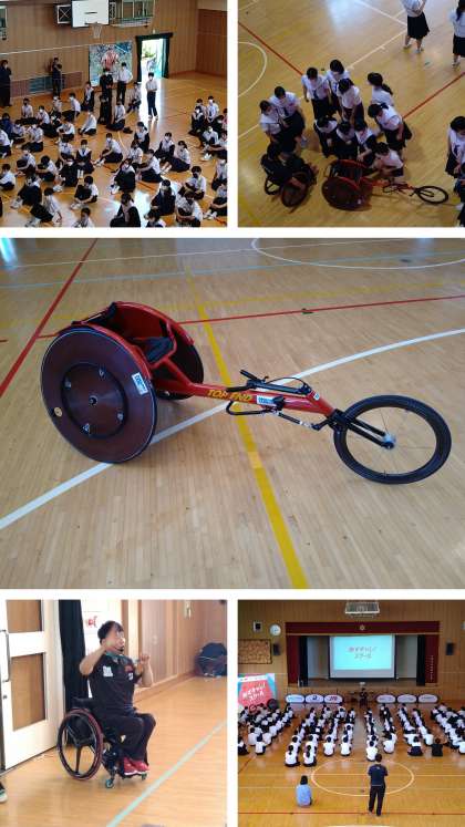 本日、2年生で「あすチャレ!スクール」(主催:日本財団パラスポーツサポートセンター)の取組を行いました。講師先生にパラリンピックに7回出場された永尾嘉章(ながお よしふみ)さんをお招きして、車いすの『レーサー体験』や『車いすリレー』を体験させていただきました。後半には、講師先生からの講話があり、陸上競技を始めたきっかけや、パラリンピック出場を目標に「決してあきらめないことを学んだ」というお話を聴かせていただき、「生徒の皆さんには、大好きなことを必死で頑張ってほしい」と締めくくられました。