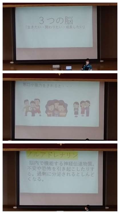 続いて担当の先生から、『3つの脳(爬虫類脳・哺乳類脳・人間脳)』についてのお話がありました。