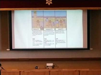担当の先生からは、平等(誰もが同じサポートが受けられ状態)・公平(誰もが必要なサポートを受けて公平性を生む状態)・公正(不公平さの原因が解決されることで障壁が取り除かれた状態)についてのイラストが示されました(真ん中の写真)。