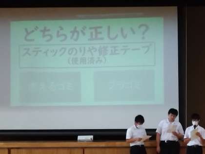 美化委員からゴミの分別クイズがありました。正しくゴミを分別しましょう。