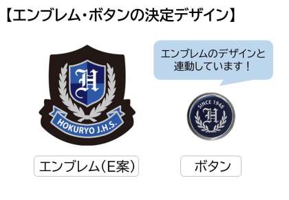 令和6年度からの新標準服のエンブレムとボタン(釦)が決まりました。4月24日〜5月14日の期間で生徒・保護者・教職員の皆さんに、デザインアンケートにご協力いただきました。「ありがとうございました!