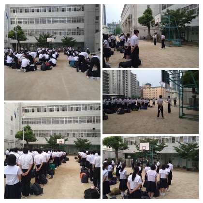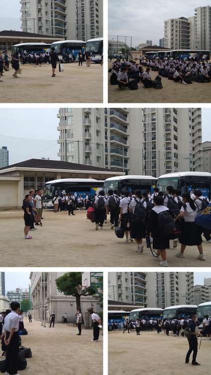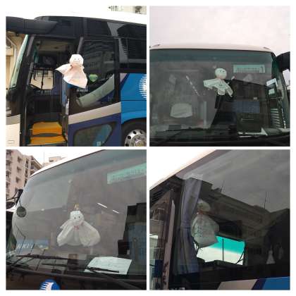 予定通り8時に出発しました。バスにも、てるてる坊主が!