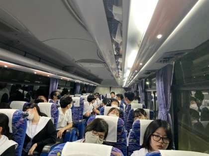 男子は元気!バス後方では流れている曲に合わせて合唱大会が行われています。
