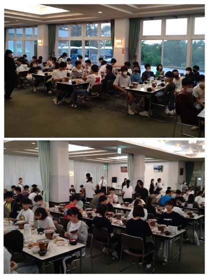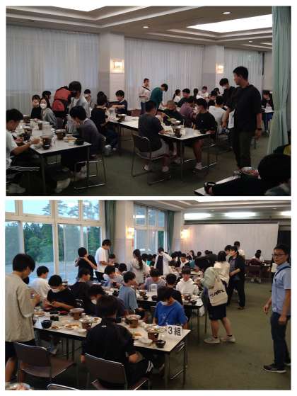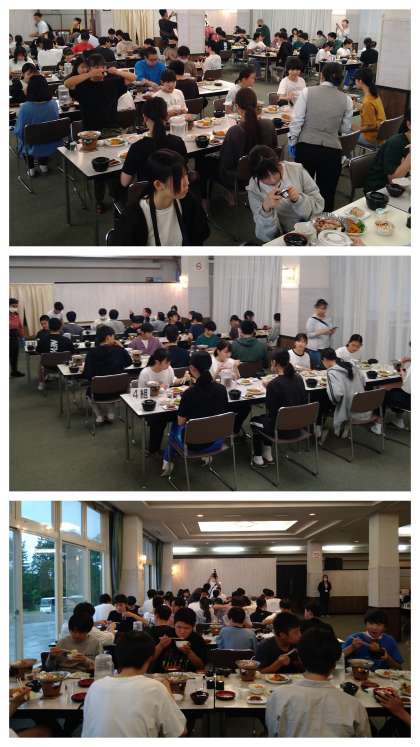 入館式に続いて、夕食でした。すき焼きに、ミンチカツに、餃子に、グラタンに、デザートにと盛り沢山でお腹一杯になったみたいです。
