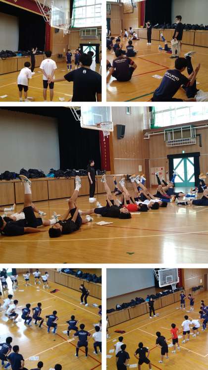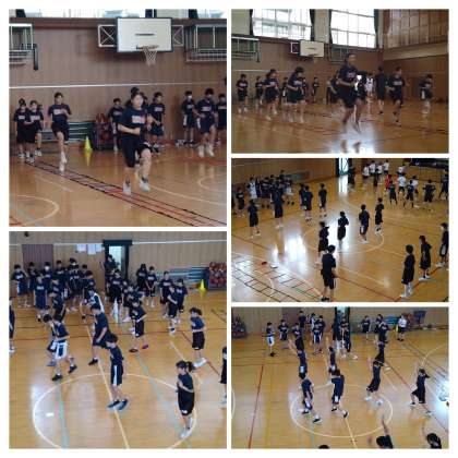 リズミカルな動きで負荷をかけ心拍数をあげるトレーニングや、運動の基本となる「パワーポジション」の練習について丁寧に指導していただきました。今後の部活動の練習・トレーニングに役立つ内容でありました。