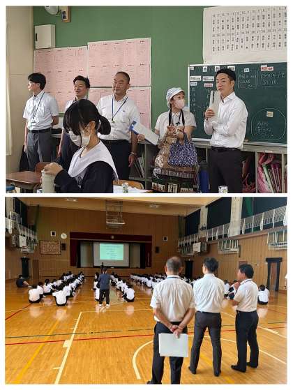 体育館では、熱中症が心配される中、空調があるおかげで快適に安全に様々な行事や授業に取り組めることのありがたさをお伝えし、実際に体育館の中にご案内し、空気感を味わっていただきました。