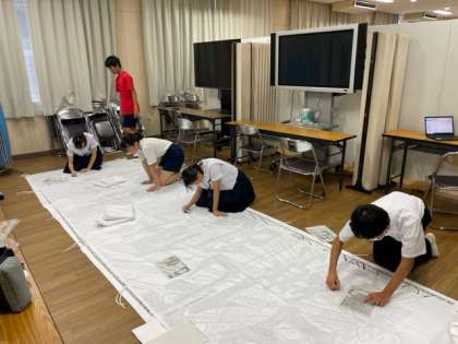 生徒会の皆さんが、スローガンをデザインした横断幕の下書きをしてくれています。