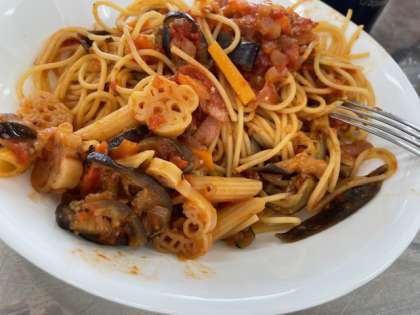 なすのトマト スパゲッティでは、「ロングパスタ」と「ペンネ、マカロニ」の2種類を作りました。