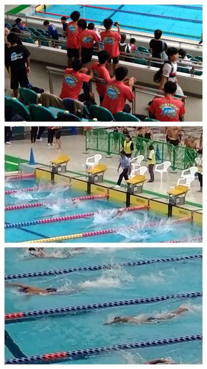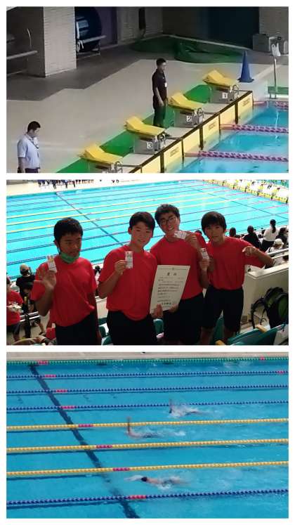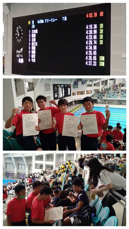 2年男子400メートルフリーリレー第3位「良く頑張りました!おめでとう」。部員・保護者の皆さんの必死の応援のお蔭で、みごとに銅メダル獲得しました。
