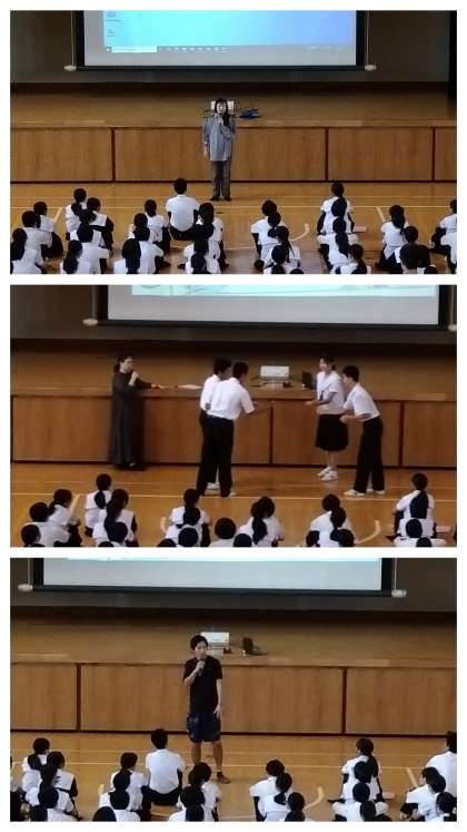 今朝は、2年生の学年朝礼がありました。担当の先生からは、体育大会の練習、学級旗の制作の様子を見ていて、皆さんの1年間の成長が感じられました。