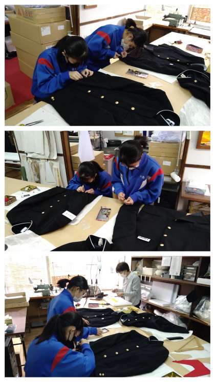 写真は、学生服のボタンをつける作業員中の様子です。
