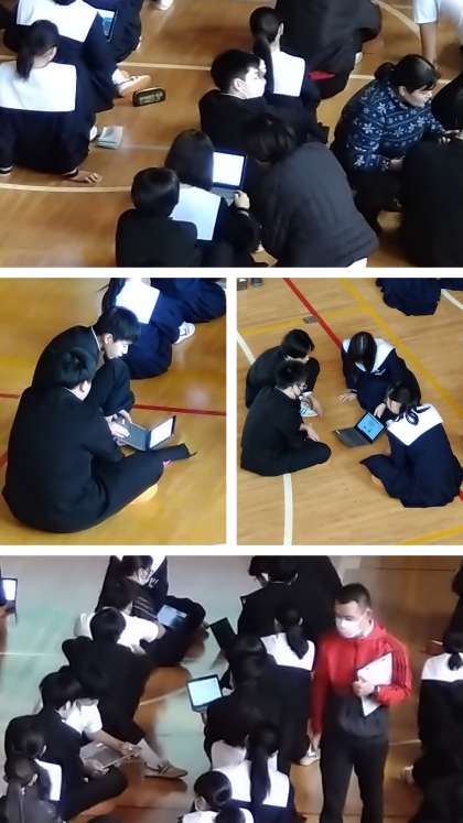 パソコンを使って班で話し合ったことをスクリーンで共有する形(大学ではこういう形の授業に変わってきているようです)での授業でした。生徒たちから出る意見から「いつまでも子どもだと思っていたらいけない(すごっ!)」と感じました。