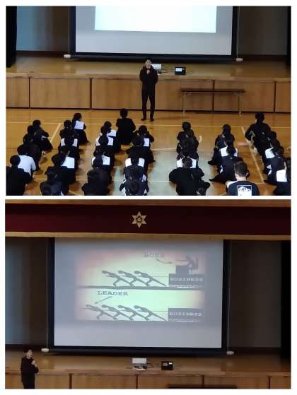 昨日、2年生の学年朝礼がありました。担当の先生からは、高校生の時に出会ったことば『ボスとリーダーの違い』についてのお話がありました。
