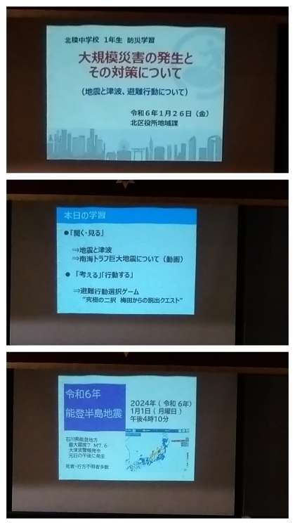 1年生は、『地震、津波についての講話』と『避難行動選択ゲーム』を区役所職員の皆さんのご協力で行いました。ありがとうございました。