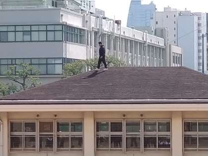N先生が格技室の屋根の上に!