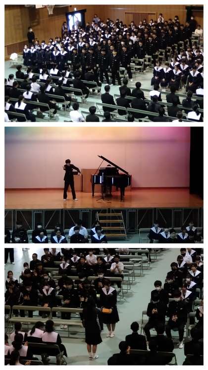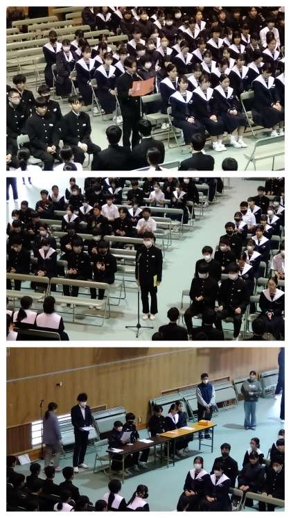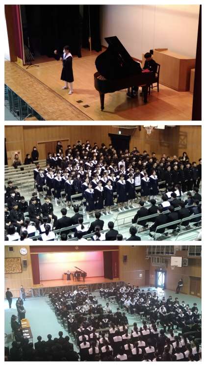 在校生のお別れのあいさつ、卒業生のお別れのあいさつに続いて、1年生の合唱『空も飛べるはず』、2年生の合唱『story』がありました。
