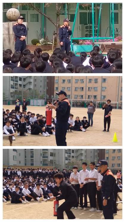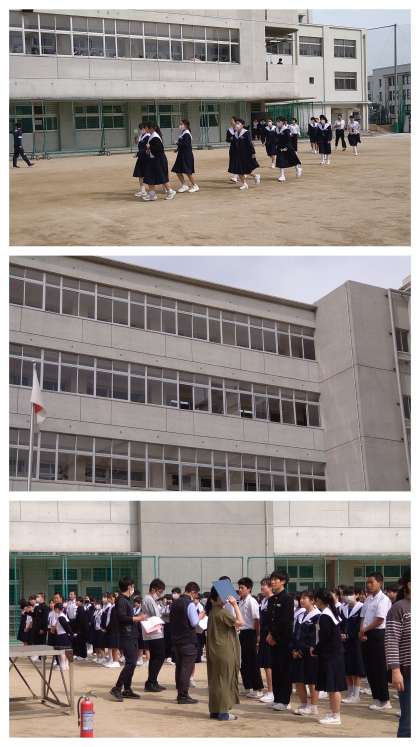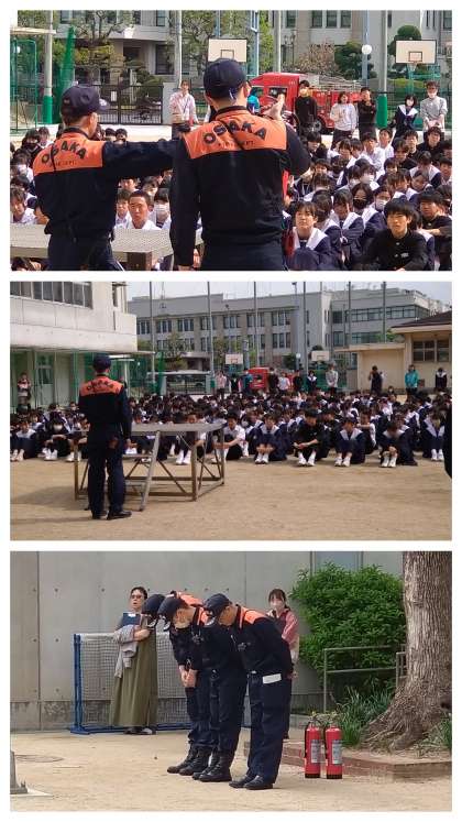 本日、6限目に大阪市の消防局より署員の方々をお招きして『避難訓練(火災)』を行いました。