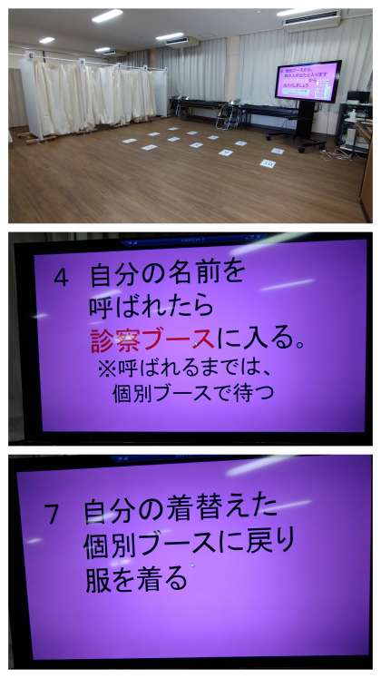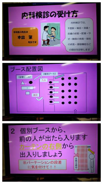 本日は、3年生の内科検診が行われました。多目的室の待機場所には、電子黒板が設置され、新しい方法での健康診断の受け方について分かりやすく映し出されていました。診断は、スムーズに進んだようです。