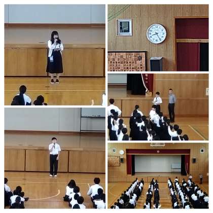 1年生の皆さんは、今から言う質問に心の中で応えてくださいと投げかけ、「チャイム着席はできていますか」「あいさつは、どうですか」「制服の着用はきちんとできていますか」「委員会や係の仕事は責任をもってやれていますか」「時間守ってますか」と質問。