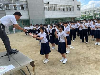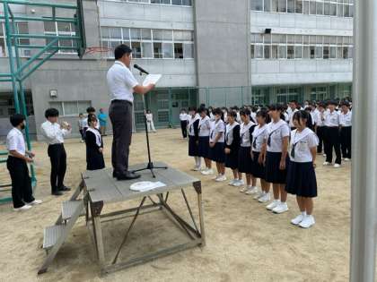 先日の春季総体で団体戦準優勝、個人戦ダブルス3位に入賞を果たした女子テニス部が全校朝礼で表彰を受けました。
