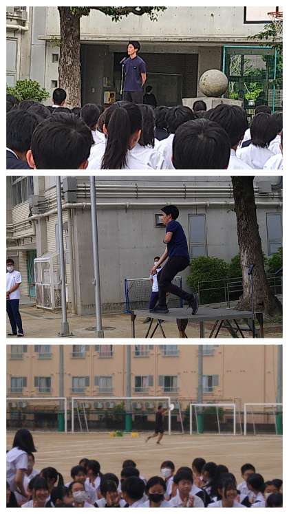 今朝の全校朝礼では、女子硬式テニス部の『表彰伝達』に続いて、『アジア・オセアニアビーチアルティメット選手権大会』の日本代表選手に選ばれた阪上海斗先生の『壮行会』が行われました。