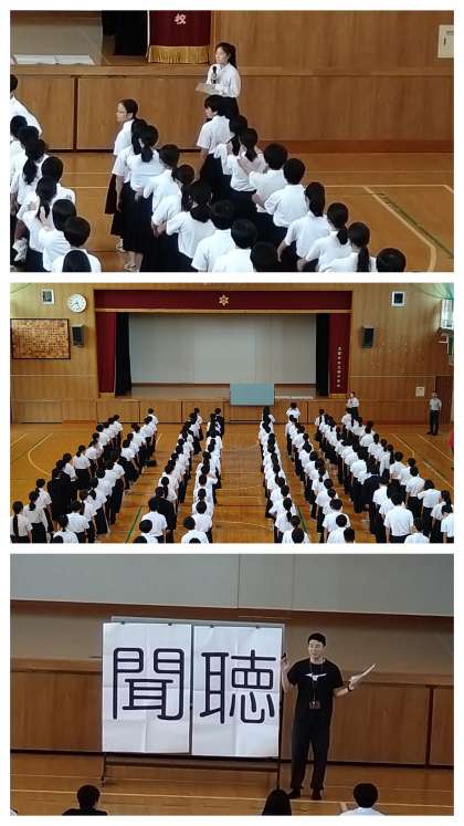 今朝は、1年生の学年朝礼がありました。担当の先生からは、人の話を『聞く』と『聴く』の違いについてお話がありました。