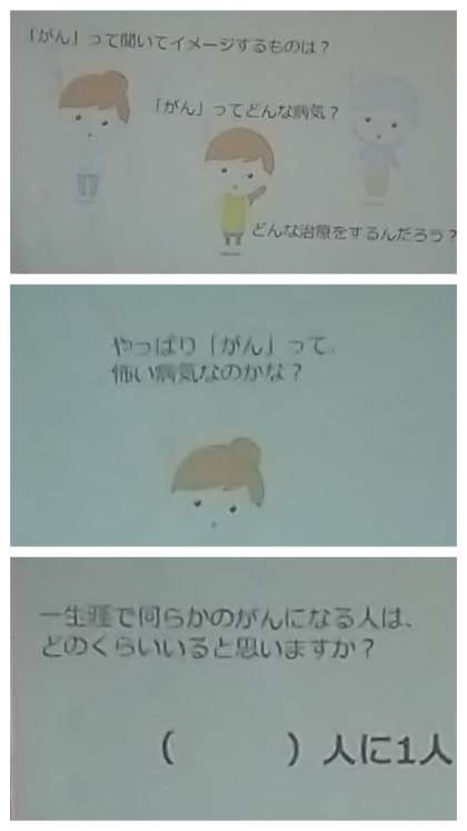 子どもたちの『がん』のイメージは、やはり怖いということでした。しかしながら、『がん』は、早期発見・早期治療により治すことが可能な病気であり、完全には予防はできないが、生活習慣などを改善することでリスクは軽減できるとのことでした。子どもたちも、保健体育科の授業でも、様々学習しているようでした。