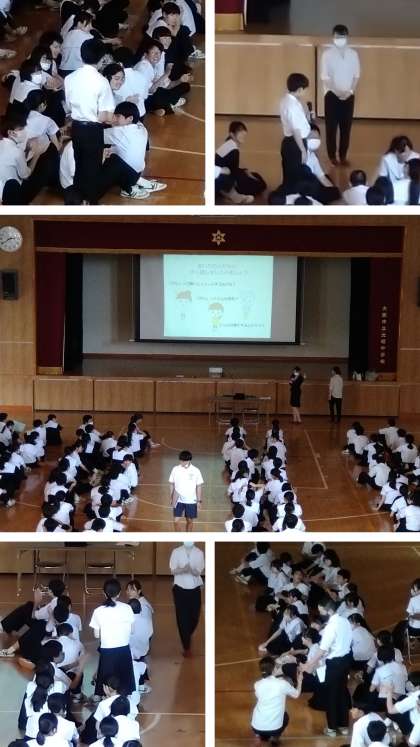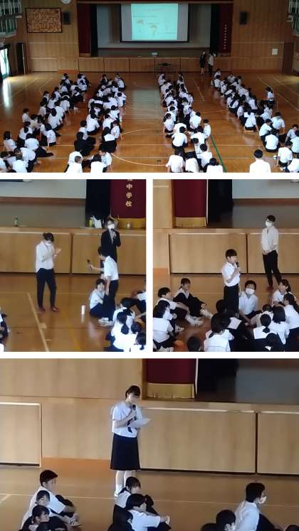 本日、6限目に2年生の生徒を対象に『がん教育』の授業を、北野病院より看護師さんを講師にお招きして行いました。パワーポイントのスライドで分かりやすく説明していただいた後は、子どもたちに考えさせ、意見を聞く(交換する)場を大切にされていたように感じました。