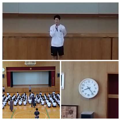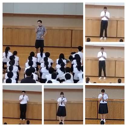 今朝は、3年生の学年朝礼がありました。6月に『アジア・オセアニアビーチアルティメット選手権大会』に出場し、見事銀メダルを獲得した阪上海斗先生より大会の報告がありました。