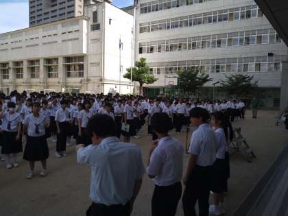 今朝は、一月ぶりに運動場で集会をすることができました。