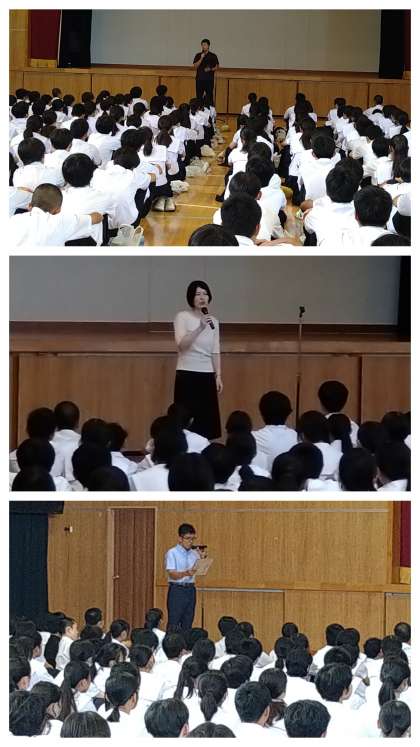 続いて、生徒指導主事の先生からも 夏休みの過ごし方について(自分のいのちは自分で守る!)、情報担当からは、夏休み中のパソコンの利用・扱いについて(アダプターの箱は大切に!)のお話がありました。