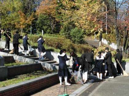 北稜中学校では、2学期期末テストの最終日に「ふれあい清掃」を行っています。保護者の皆様と各クラスの代表清掃班の生徒が、学校周辺の清掃活動を行います。