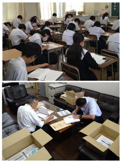 生徒たちは一生懸命テストに取り組んでいます。また、先生方もテストの仕分けや確認作業に必死です。