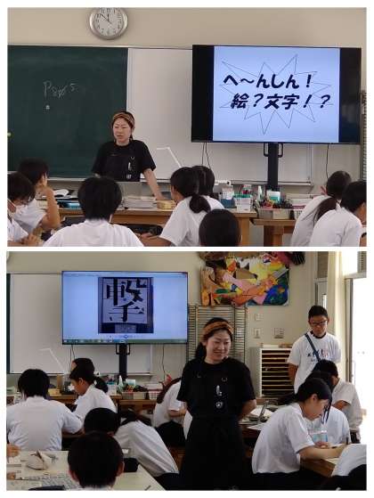 今回の授業では、「へ〜んしん!絵?文字!?」を単元テーマとし、基本的な技術(レタリング)の習得と、発想力の深まりを目的としていました。