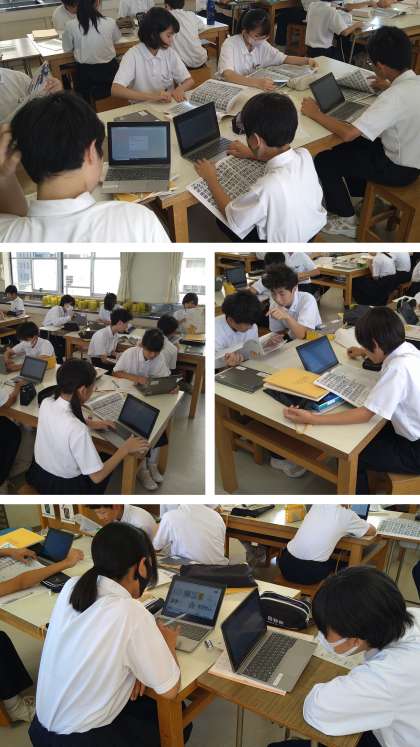 電子黒板、学習者用端末、資料集をフルに活用し、構想を練っている生徒たちの姿が見られましたました。